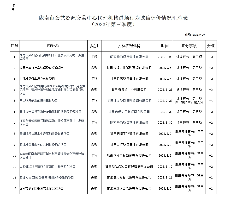 根據(jù)《甘肅省公共資源交易代理機(jī)構(gòu)管理辦法》(甘政辦發(fā)〔2019〕107號(hào))和《隴南市公共資源交易中心代理機(jī)構(gòu)進(jìn)場(chǎng)行為誠(chéng)信評(píng)價(jià)實(shí)施制度(試行)》規(guī)定,現(xiàn)對(duì)2023年第三季度,共 12 家代理機(jī)構(gòu) 13 條進(jìn)場(chǎng)行為誠(chéng)信評(píng)價(jià)記錄予以通報(bào)(詳見附表)。請(qǐng)各代理機(jī)構(gòu)嚴(yán)格遵守各項(xiàng)規(guī)章制度、誠(chéng)實(shí)守信,規(guī)范操作,為招標(biāo)人和采購人提供專業(yè)、高效、規(guī)范的招標(biāo)代理服務(wù)。