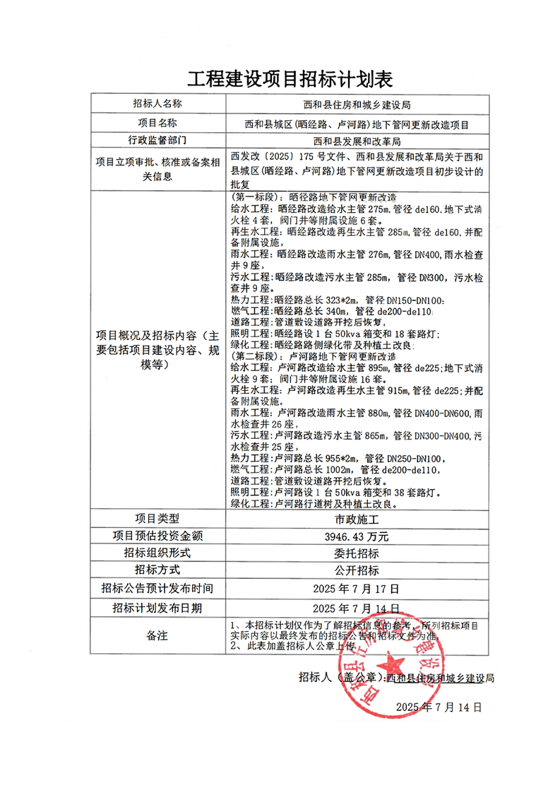 西和縣城區(qū)(曬經(jīng)路、盧河路)地下管網(wǎng)更新改造項(xiàng)目