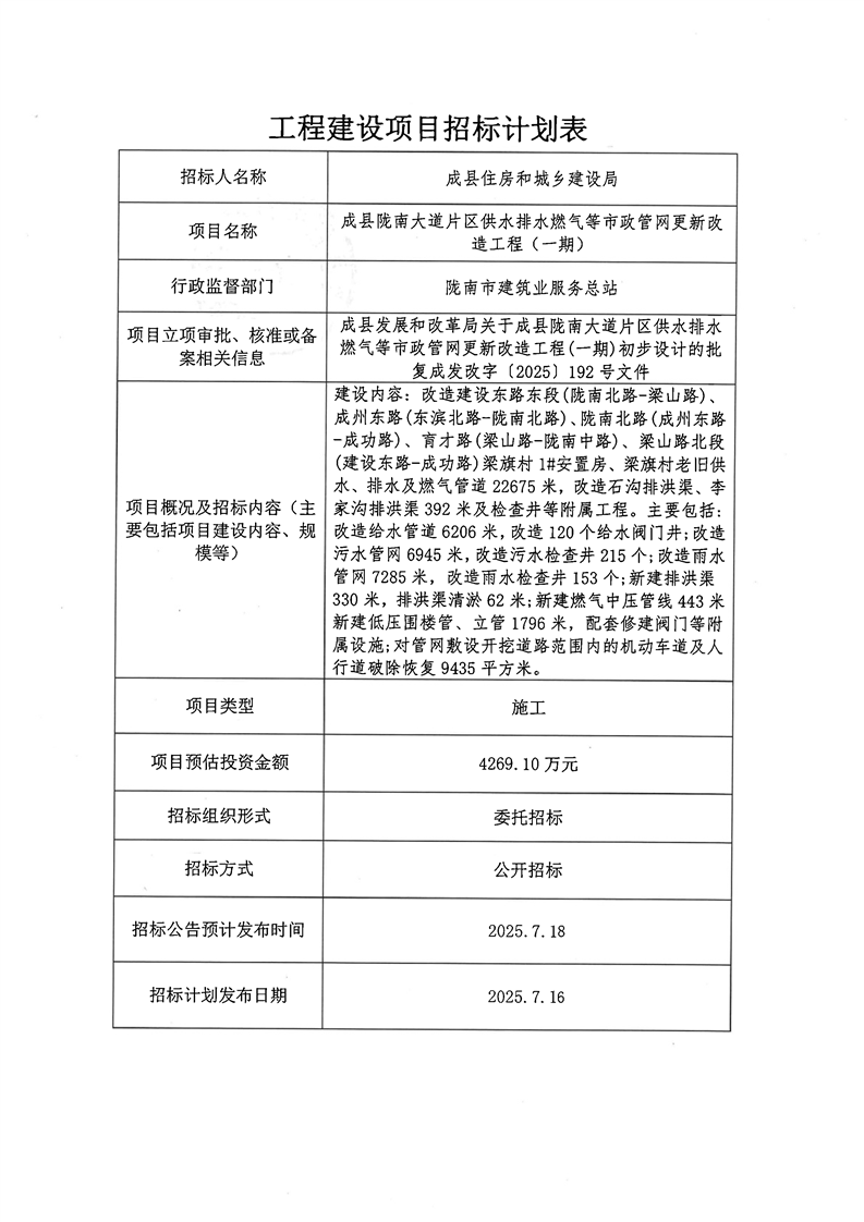 成縣隴南大道片區(qū)供水排水燃氣等市政管網更新改造工程(一期)