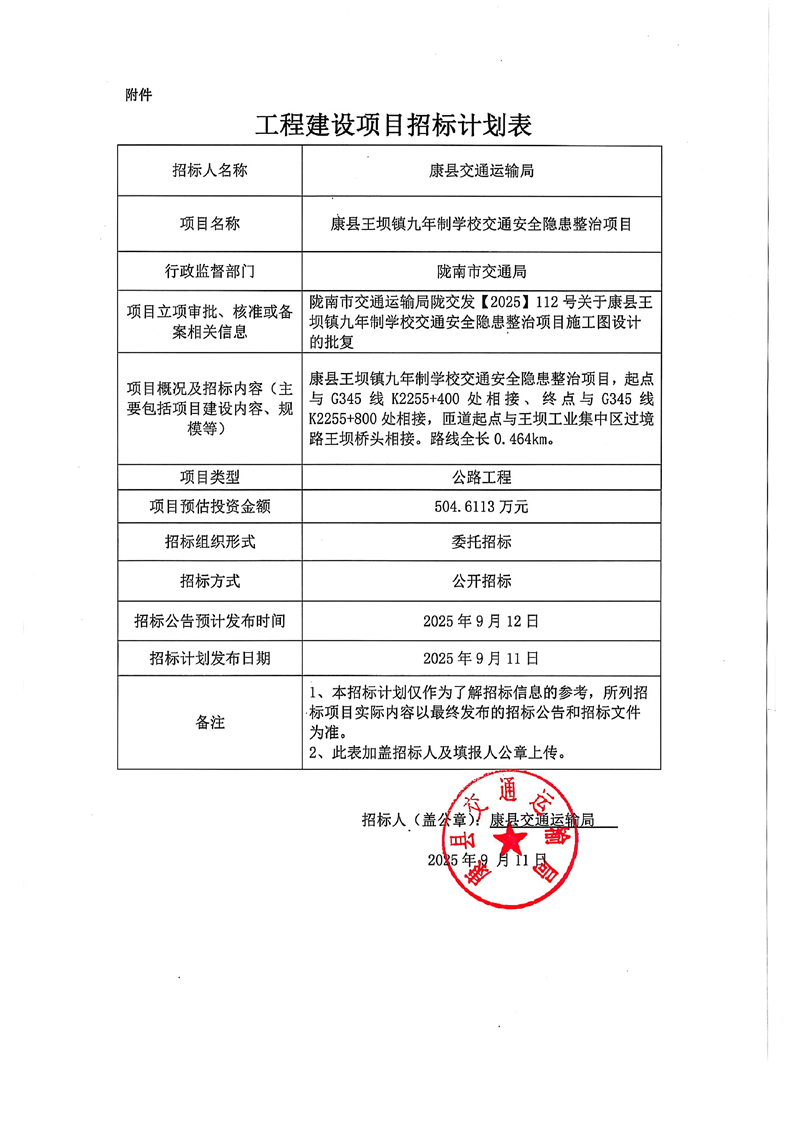 康縣王壩鎮(zhèn)九年制學(xué)校交通安全隱患整治項(xiàng)目