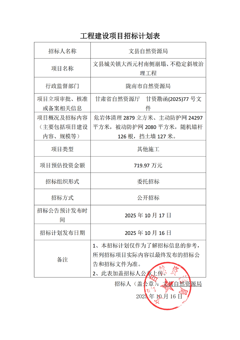 文縣自然資源局工程建設(shè)項目招標計劃.pdf